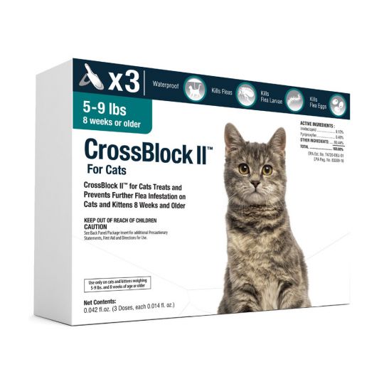 CrossBlock II is a topical flea treatment for cats that kills adult fleas as well as their eggs and larvae. It contains imidacloprid and pyriproxyfen, and starts killing fleas within 2 hours and continues to work for 1 full month of protection. CrossBlock also prevents re-infestation of fleas by breaking the life cycle and preventing fleas from reproducing.